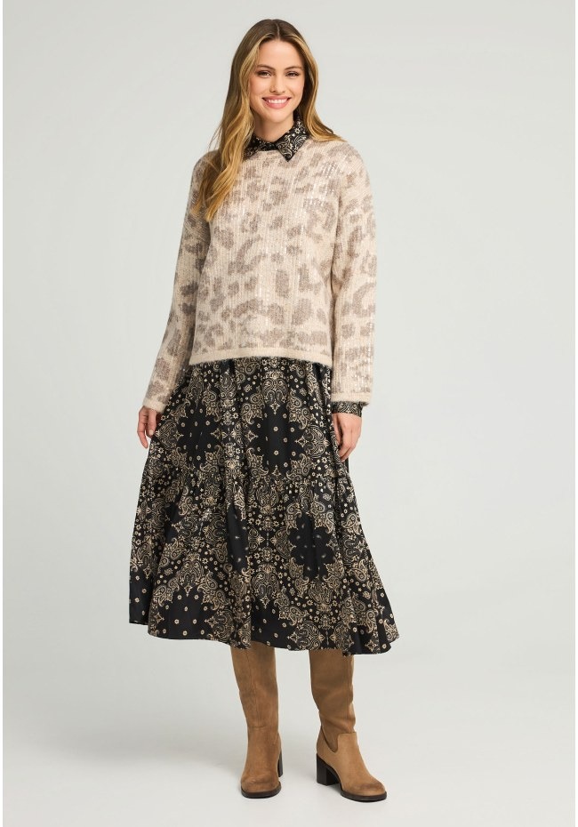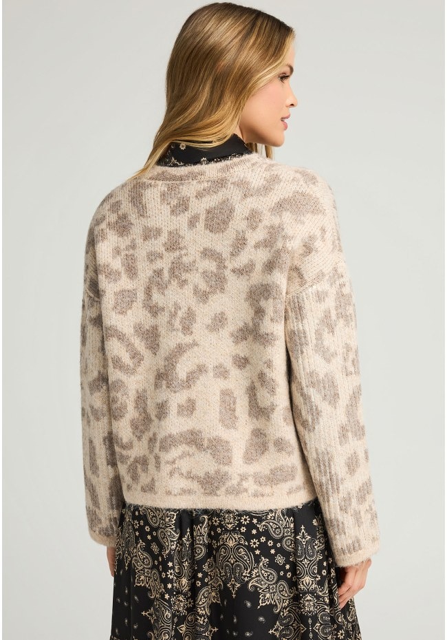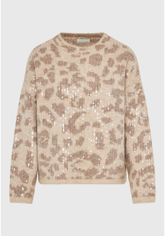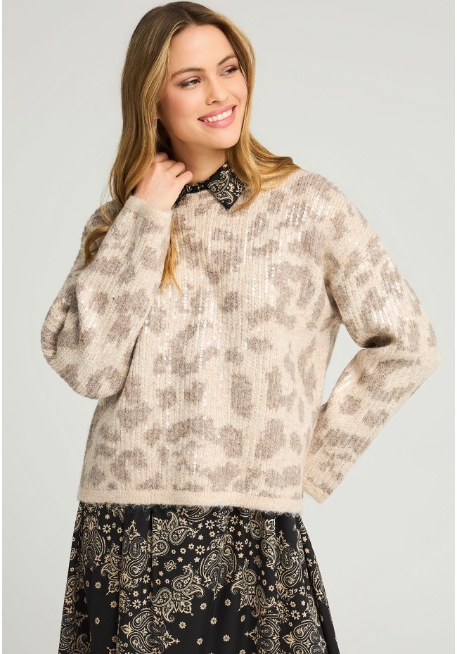 Γυναικείο πλεκτό με κανονική εφαρμογή, ιδανικό για τη φθινοπωρινή και χειμερινή σεζόν. Διαθέτει animal print σχέδιο και παγιέτες και είναι κατασκευασμένο από πλεκτά υφάσματα με μείγμα μαλλιού. Η στρογγυλή λαιμόκοψη και τα μακριά μανίκια προσφέρουν άνετη κάλυψη, ενώ ο σχεδιασμός του το καθιστά ιδανικό για κομψές αλλά και καθημερινές εμφανίσεις. Συνδύασε το με σκούρο τζιν ή παντελόνι κοστουμιού για μια ισορροπημένη, μοντέρνα εμφάνιση.