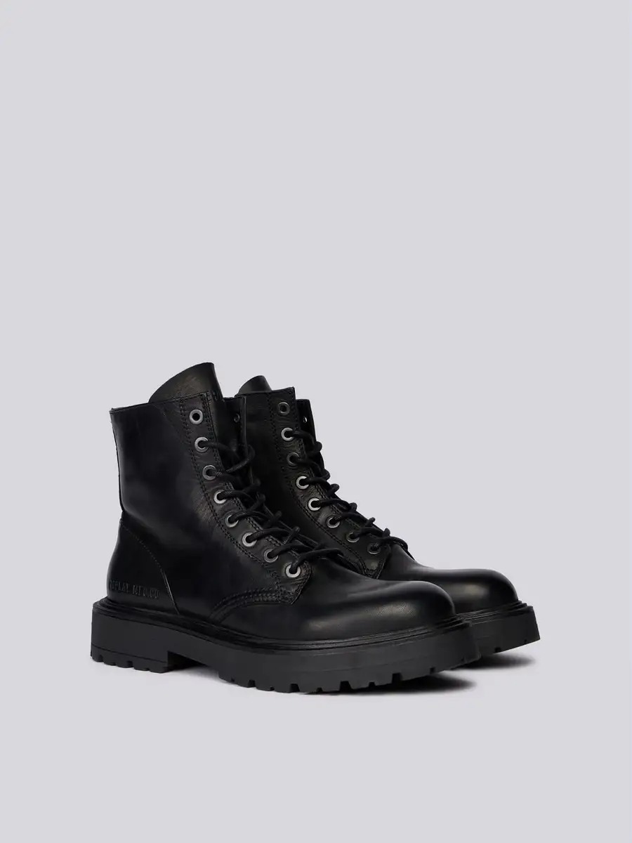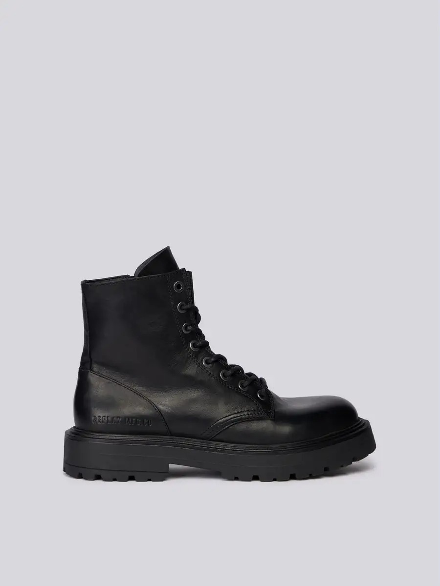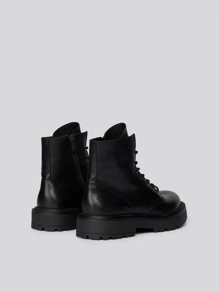 Uranus Dark round-toe ankle boots with a leather upper and decorative laces. This style features a practical zip closure on the inner side and is distinguished by the Replay lettering embossed on the side and on the extra-long tongue.