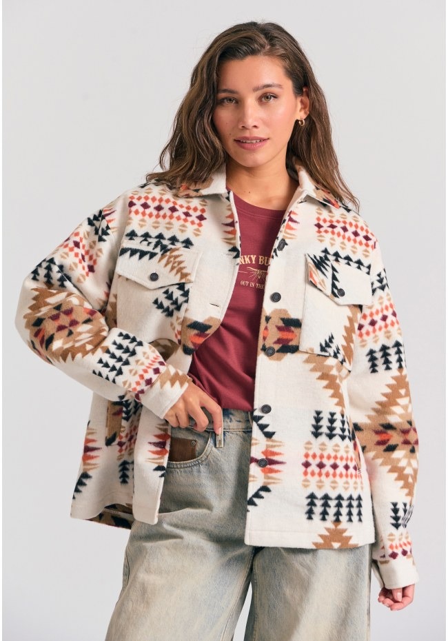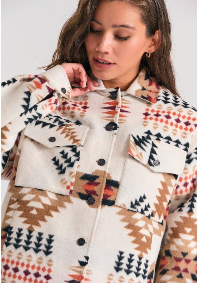 Ζεστό και άνετο πουκάμισο-τζάκετ με μοτίβο, ιδανικό για τις δροσερές μέρες. Διαθέτει κανονική γραμμή, τσέπες με καπάκι και κουμπωτό κλείσιμο, προσφέροντας πρακτικότητα και στυλ. Ένα ευέλικτο κομμάτι που μπορεί να φορεθεί μόνο του ή ως πανωφόρι πάνω από το αγαπημένο σου τοπ.