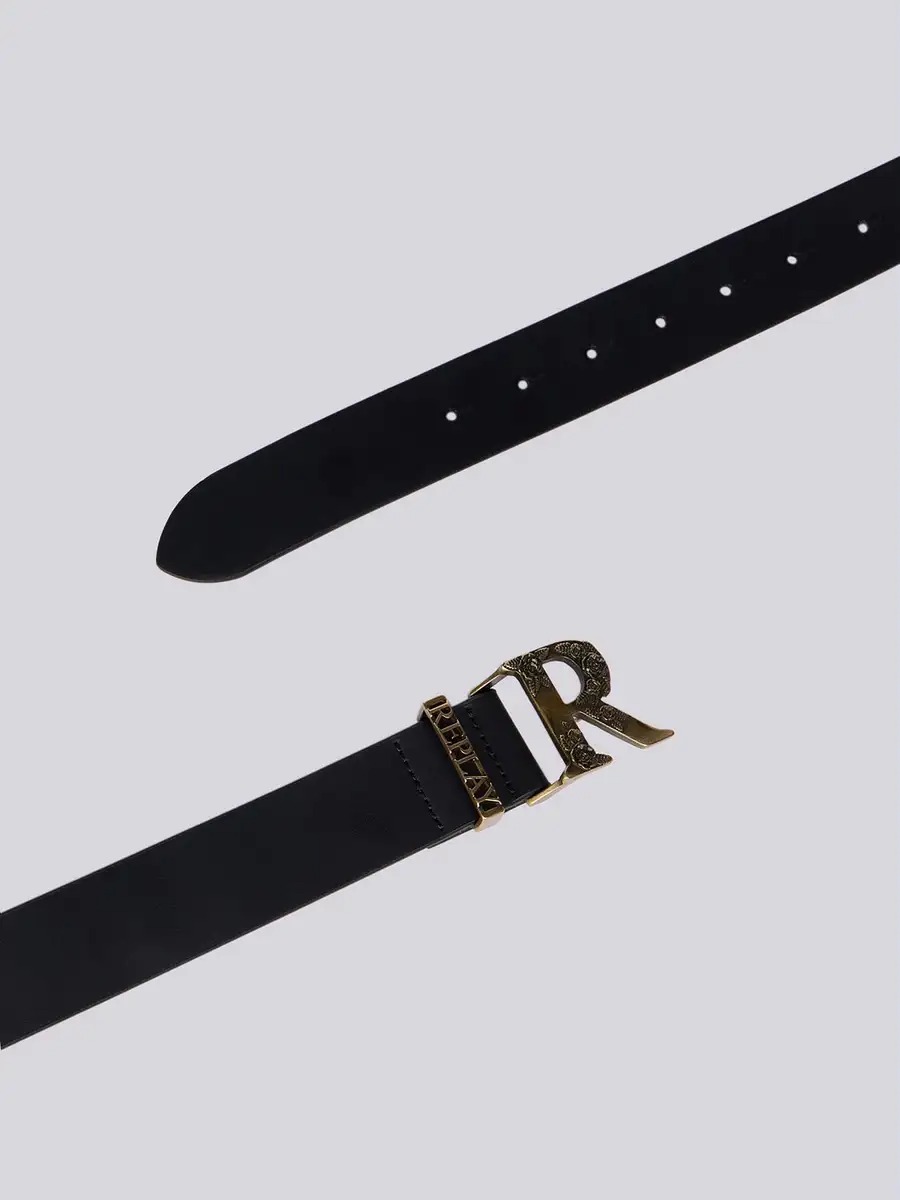 Belt crafted from a regenerated leather blend. The monogram R buckle features rose detailing and a matte finish, while the metal loop is formed by Replay lettering. Height: 3.5 cm.