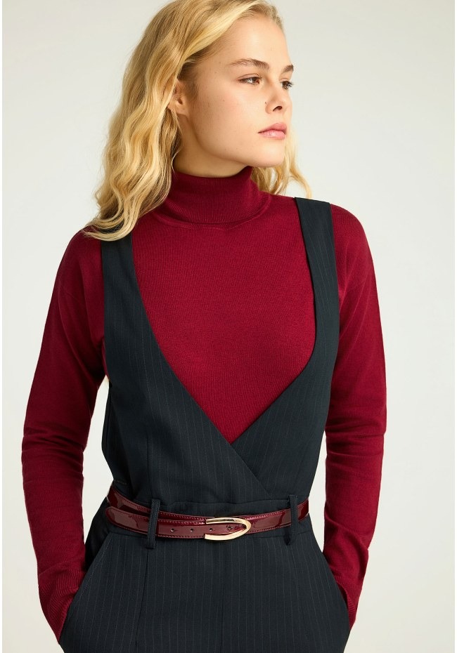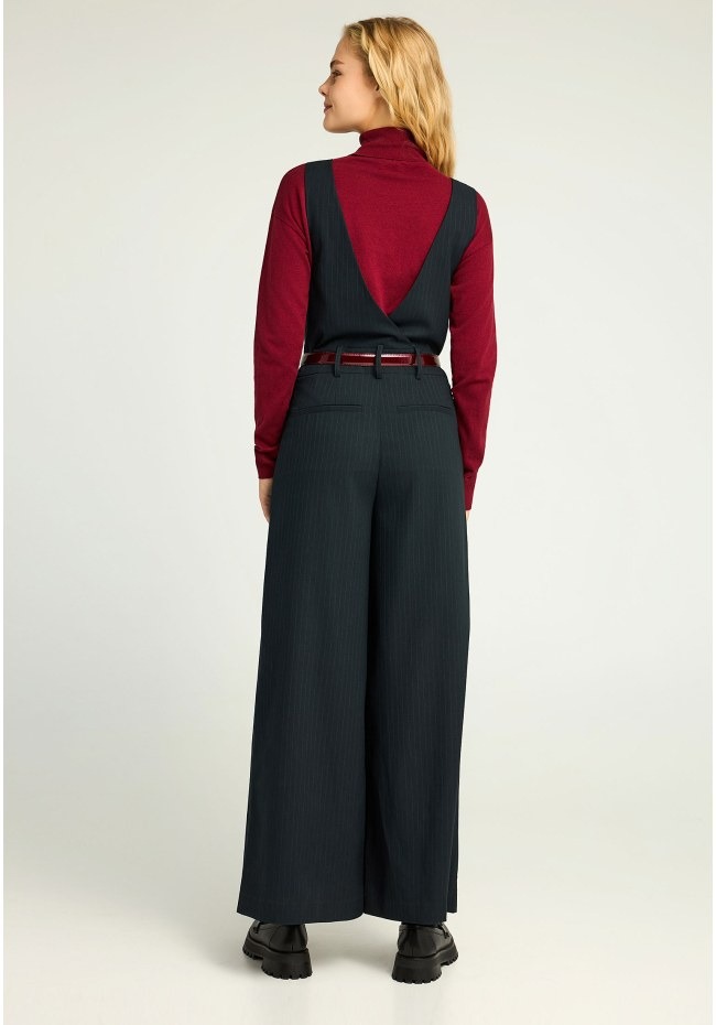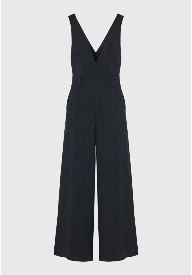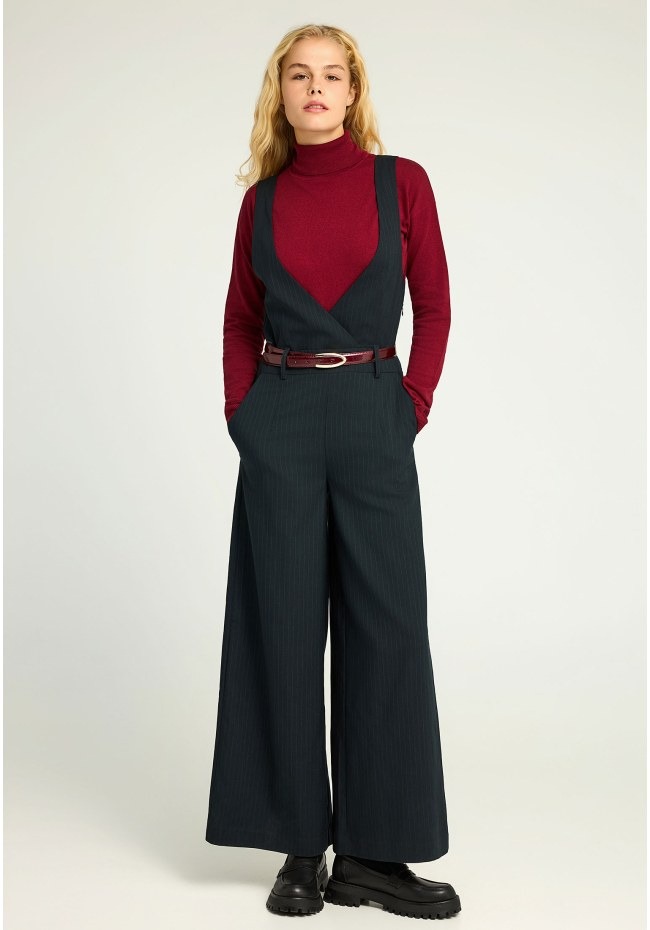 Κομψή ολόσωμη φόρμα με ριγέ σχέδιο, σχεδιασμένη για να προσφέρει ένα ολοκληρωμένο, μοντέρνο και άνετο look. Το V-neck σχέδιο και η φαρδιά γραμμή στα πόδια κολακεύουν τη σιλουέτα, είναι ιδανική για επίσημες εμφανίσεις ή για το γραφείο.