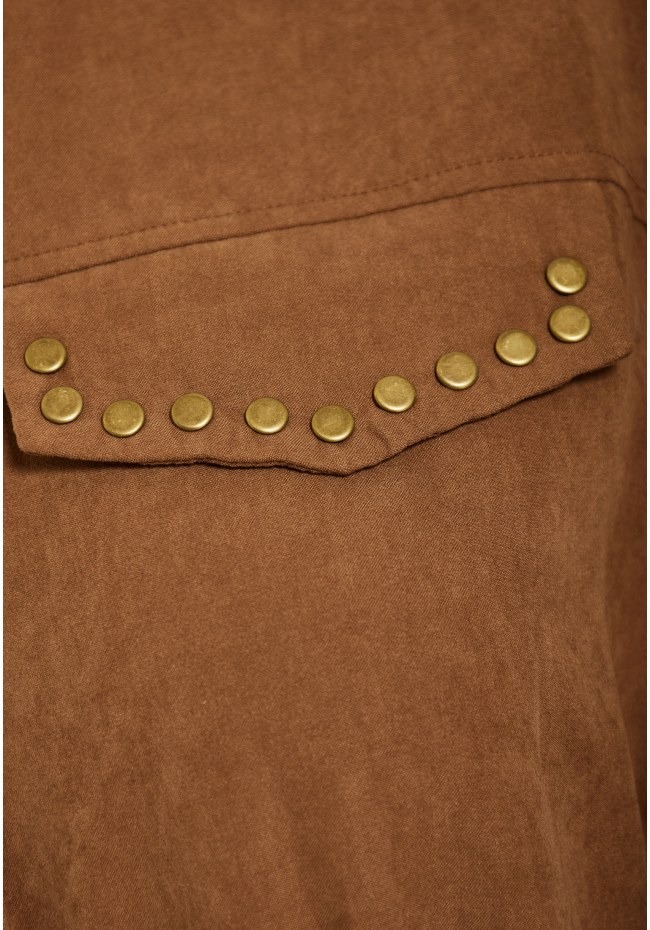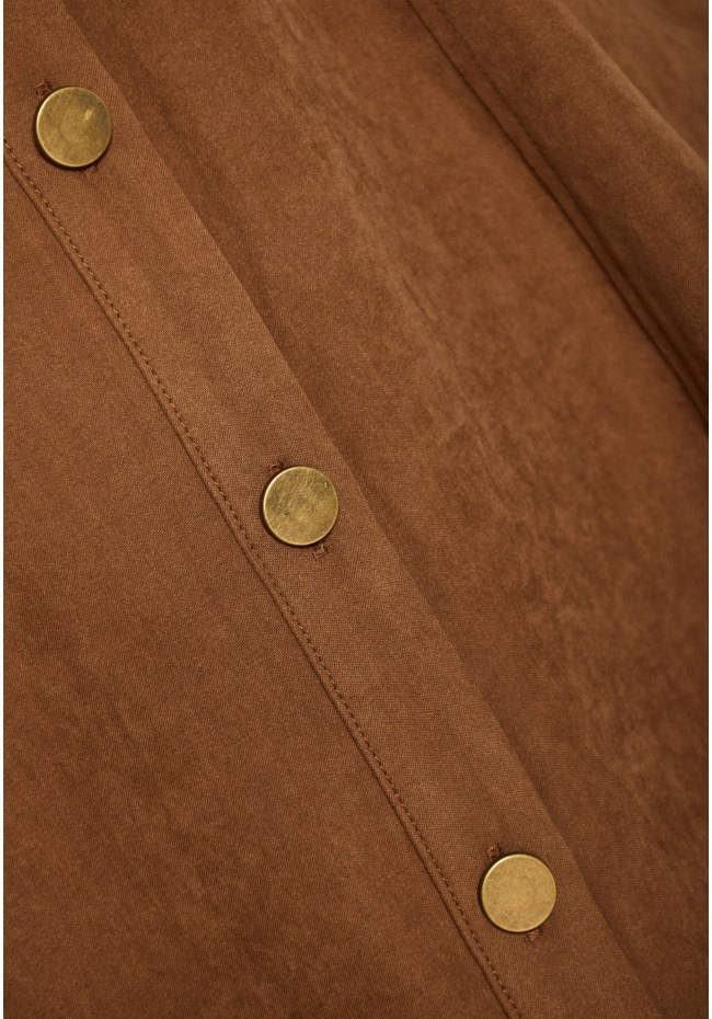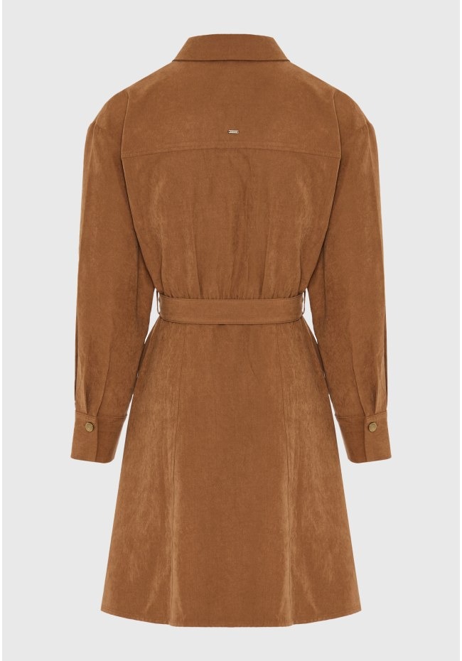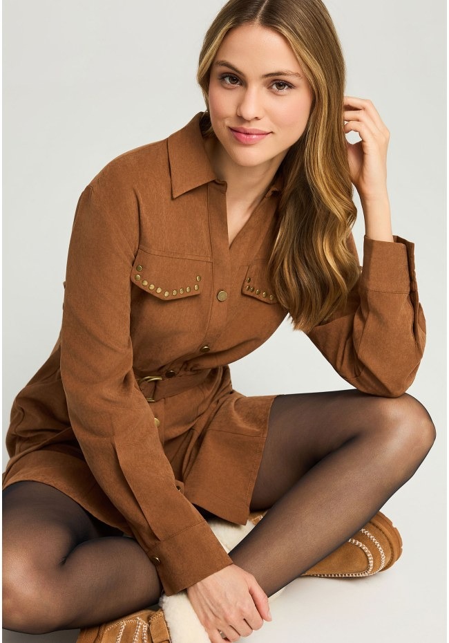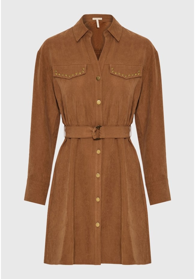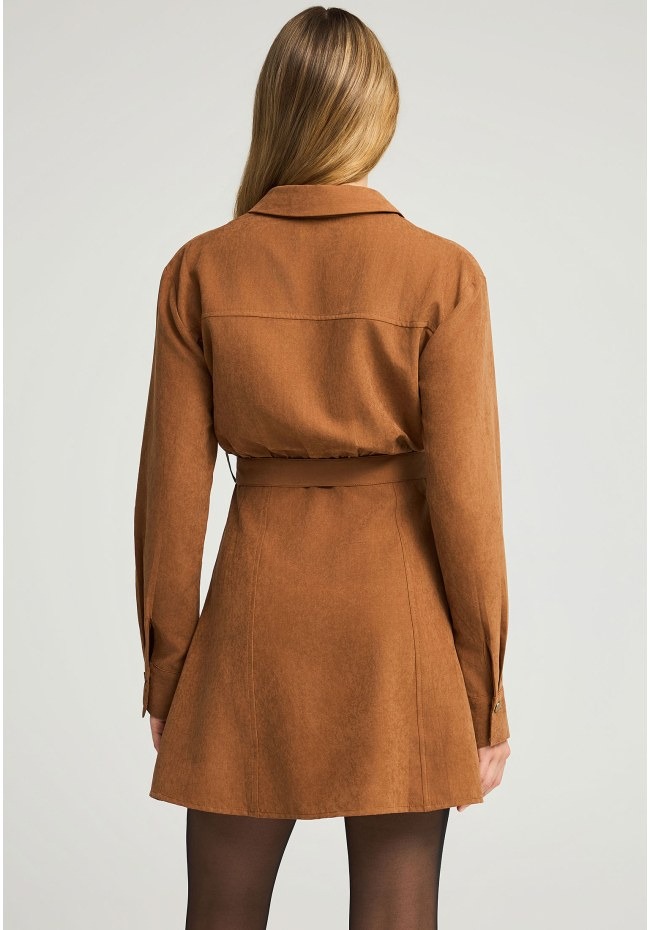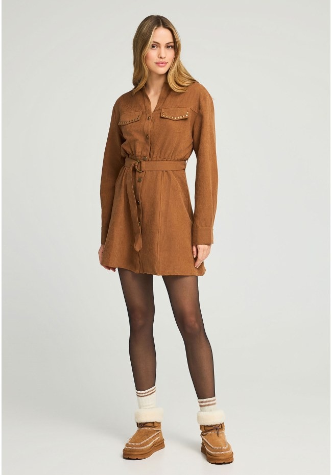 Αναβαθμίστε το φθινοπωρινό και χειμωνιάτικο look σας με αυτό το μίνι φόρεμα από σουέντ σε σκούρους μονοχρωματικούς τόνους. Διαθέτει κλασικό γιακά, μακριά μανίκια και στρογγυλή, καλυμμένη πλάτη για άψογη εφαρμογή με ζώνη στη μέση που αναδεικνύει τη σιλουέτα. Το μονόστρωμα σχέδιο εντυπωσιάζει με ίσιο στρίφωμα, μπροστινό σκίσιμο, διακοσμητικά τρουκ και τσέπες με καπάκια για πρακτική πινελιά. Η V λαιμόκοψη ολοκληρώνει το σύνολο, ιδανική για layering με statement κολιέ. Συνδυάστε με μποτάκια ή ankle boots για μια chic edgy εμφάνιση.