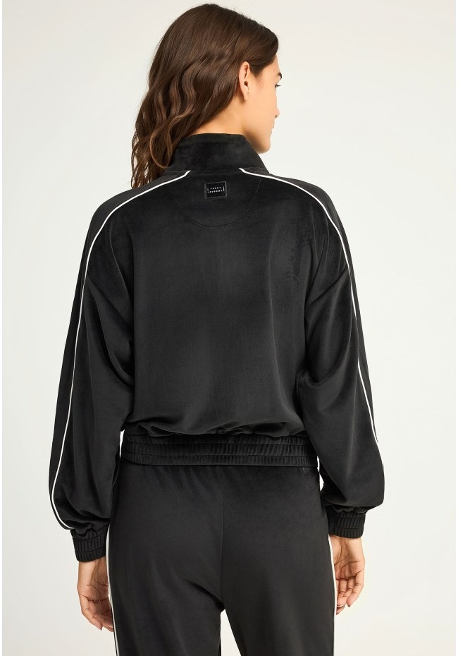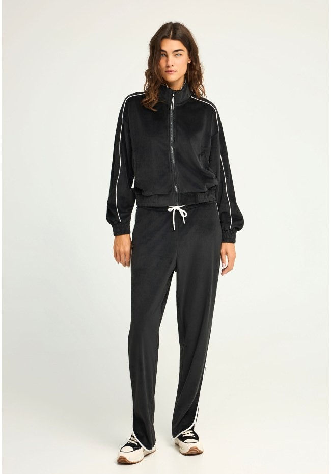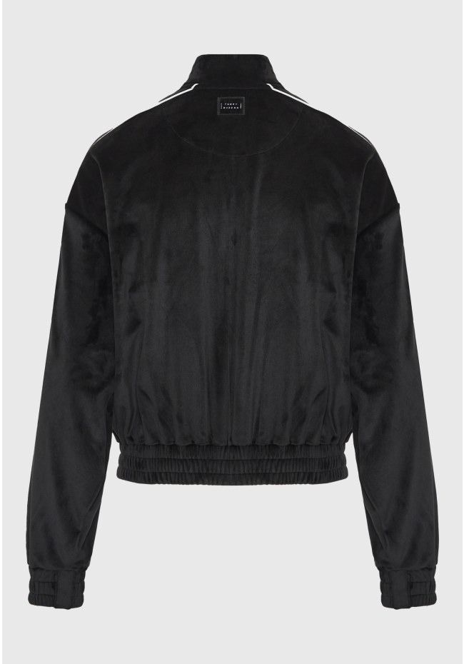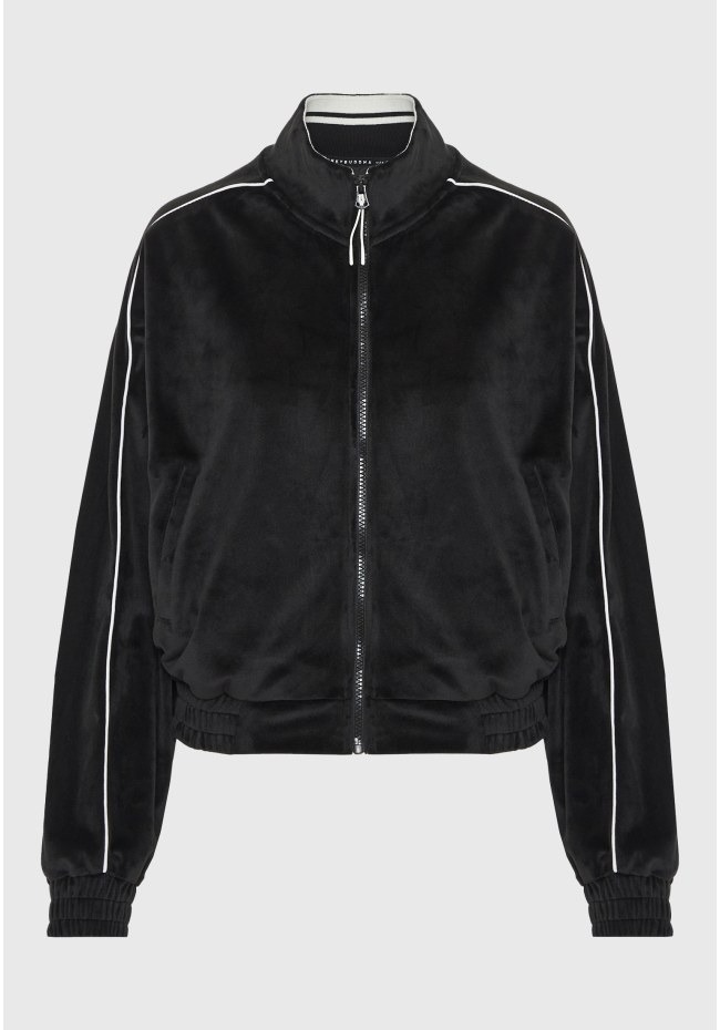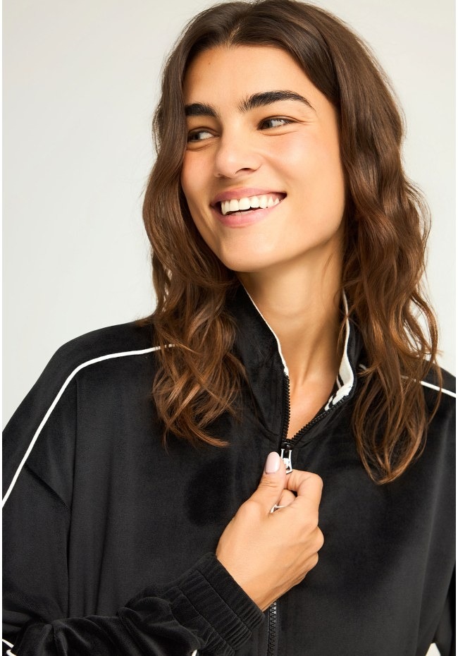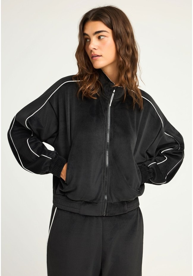 Αυτή η βελούδινη ζακέτα σε στυλ bomber είναι η ιδανική επιλογή για να συνδυάσεις την άνεση με ένα μοντέρνο athleisure στυλ.