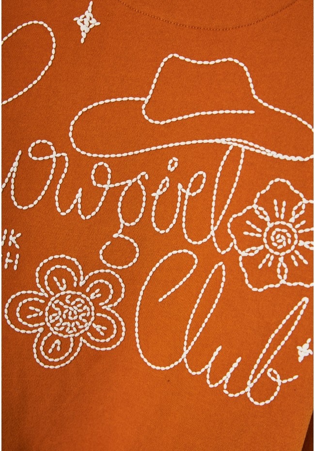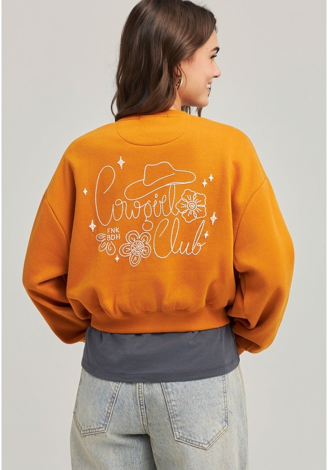 Αυτό το κοντό φούτερ είναι η ιδανική επιλογή για να συνδυάσεις άνεση και ένα ιδιαίτερο Western στυλ. Η oversized γραμμή του και το μαλακό ύφασμα εξασφαλίζουν άνετη εφαρμογή, ενώ το εντυπωσιακό κέντημα στην πλάτη με το σχέδιο “Cowgirl Club” του δίνει έναν μοναδικό και δυναμικό χαρακτήρα.