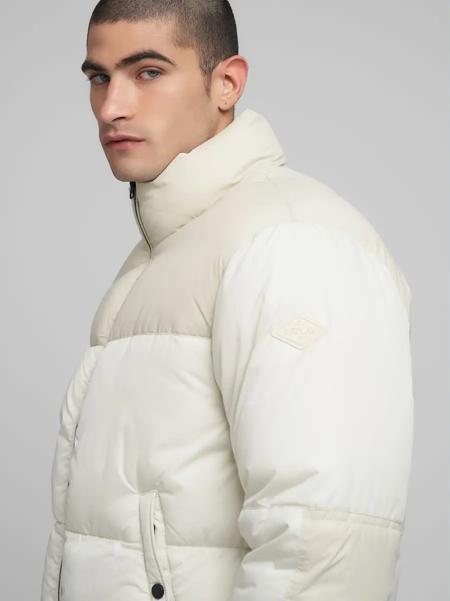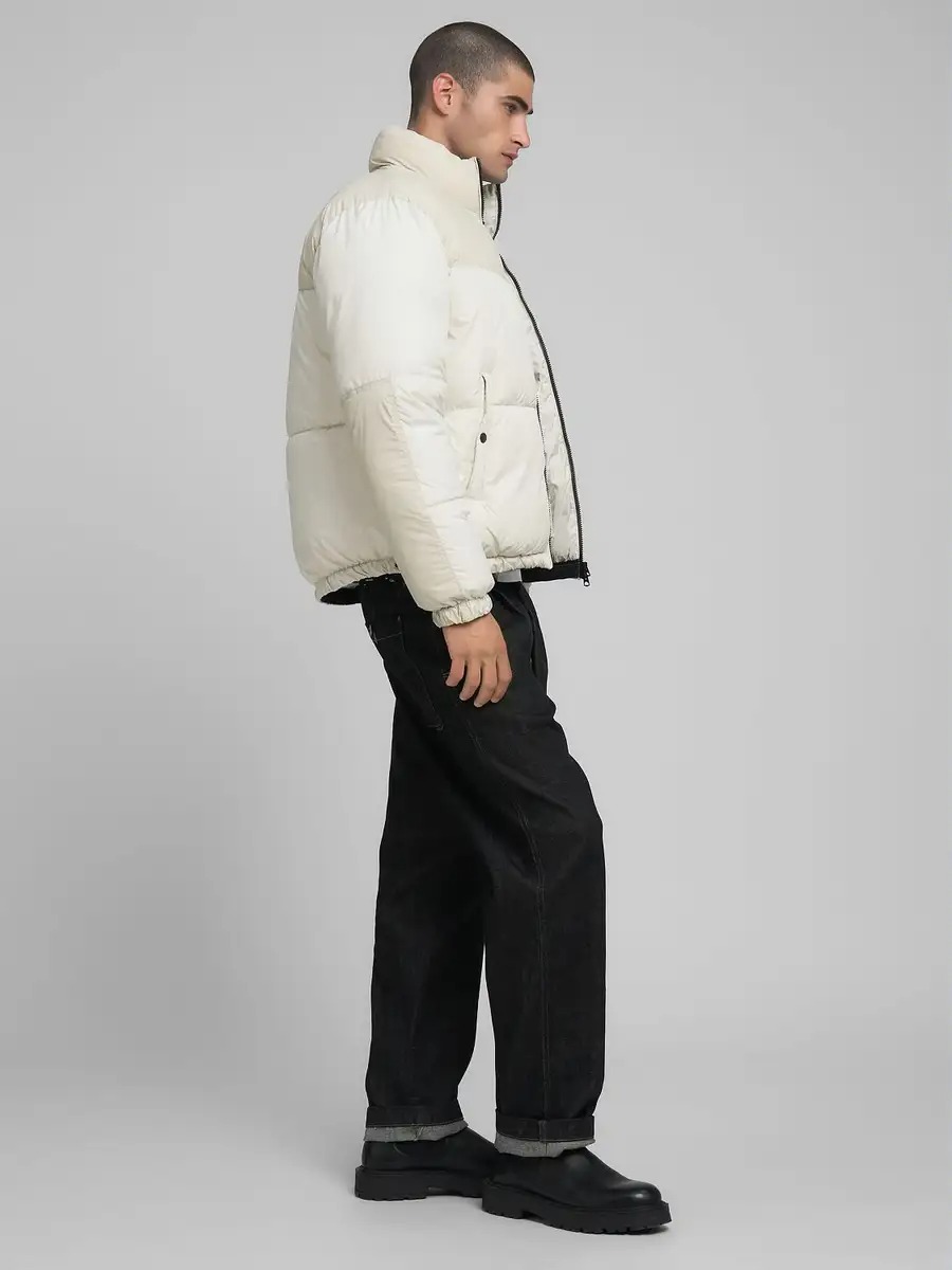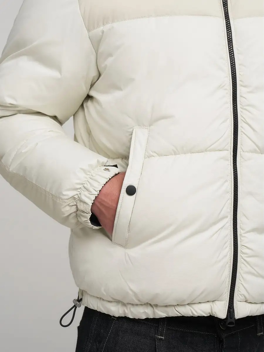 Regular-fit padded and quilted jacket in ripstop poly nylon. This piece features a slightly contrasting colour on the lower sleeves, on the upper yoke and on the high collar, and features two practical side pockets with press-stud buttons, adjustable fastenings on the cuffs and an adjustable hem with drawstring. The unmistakable Replay diamond completes the design on the sleeve. Two-way zip fastening.