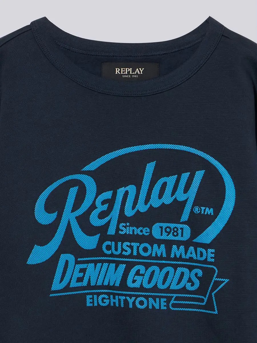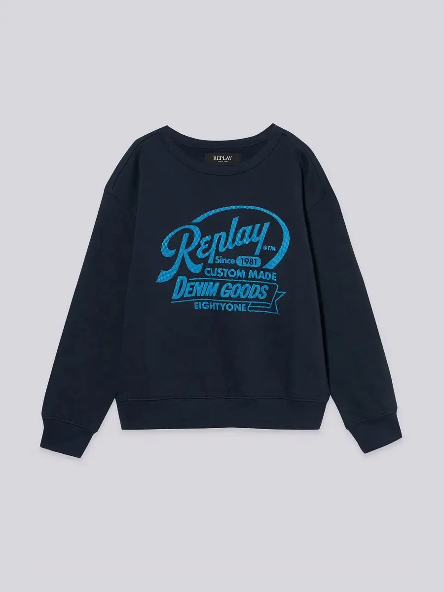 Crew-neck sweatshirt in brushed pure cotton, guaranteeing softness and comfort. This piece is a real must-have for kids’ wardrobes and features a high-density maxi-print on the front with contrasting lettering that conveys all its Replay DNA.