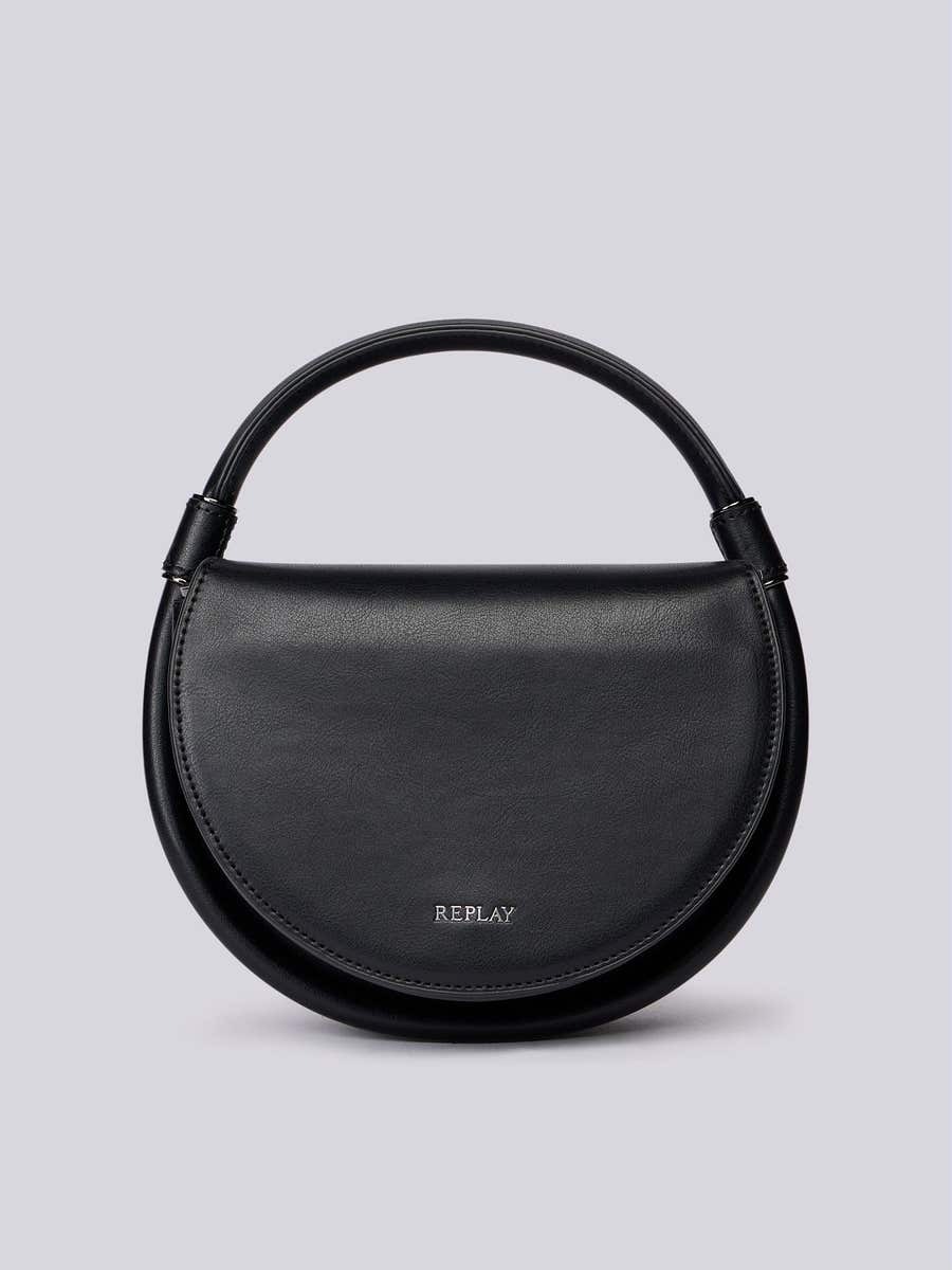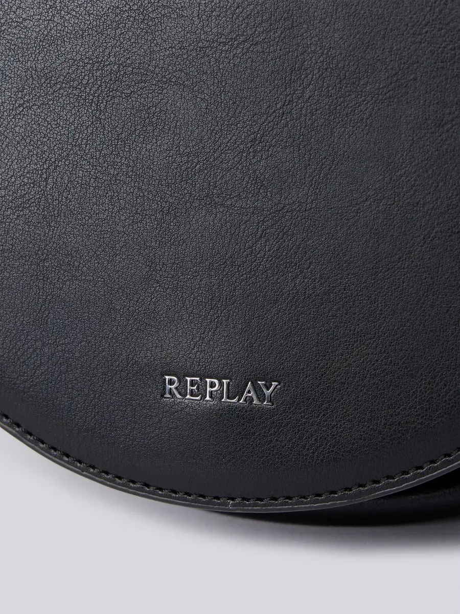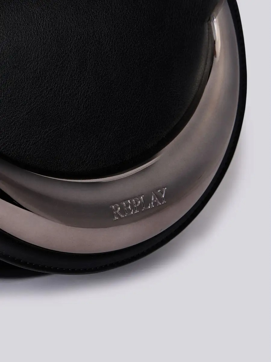 Circular bag with a smooth feel, equipped with a top handle and an adjustable, removable strap. The style features a flap and magnet button fastening on both sides. The small metallic Replay lettering on one side and the branded metal embossed half moon on the other add the finishing touches. Width 21 cm x Height 16 cm x Depth 10 cm.