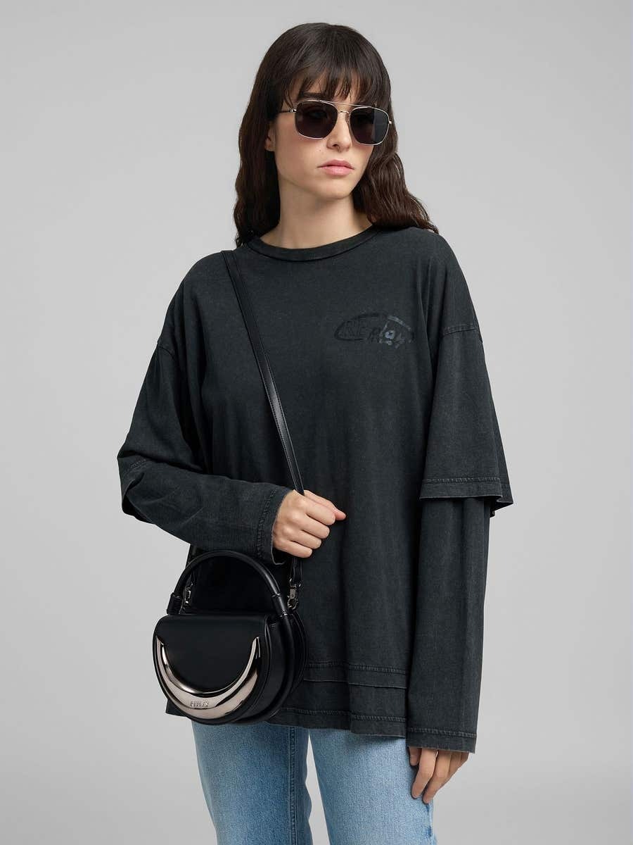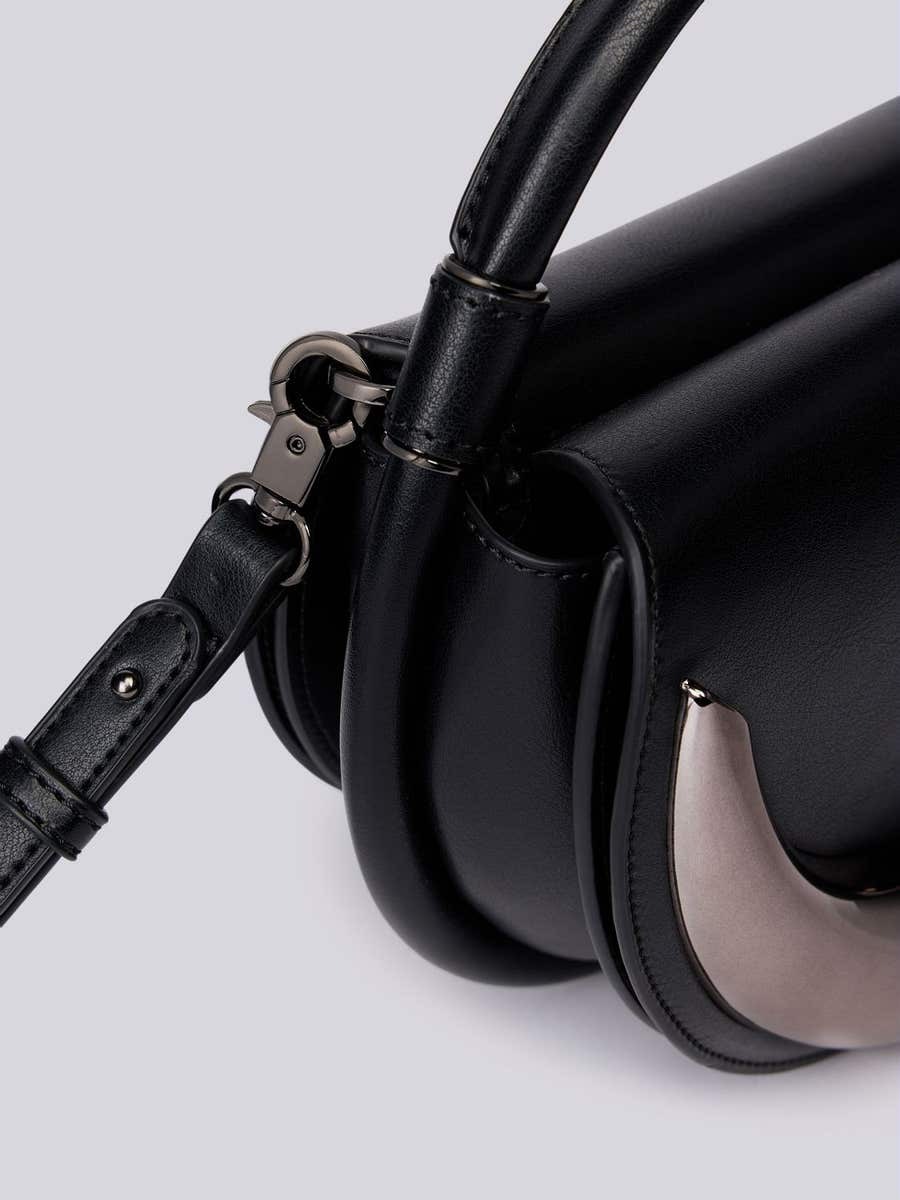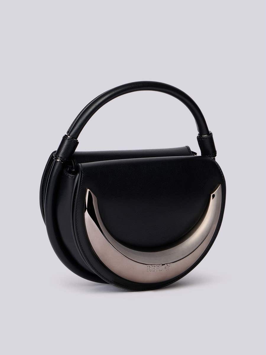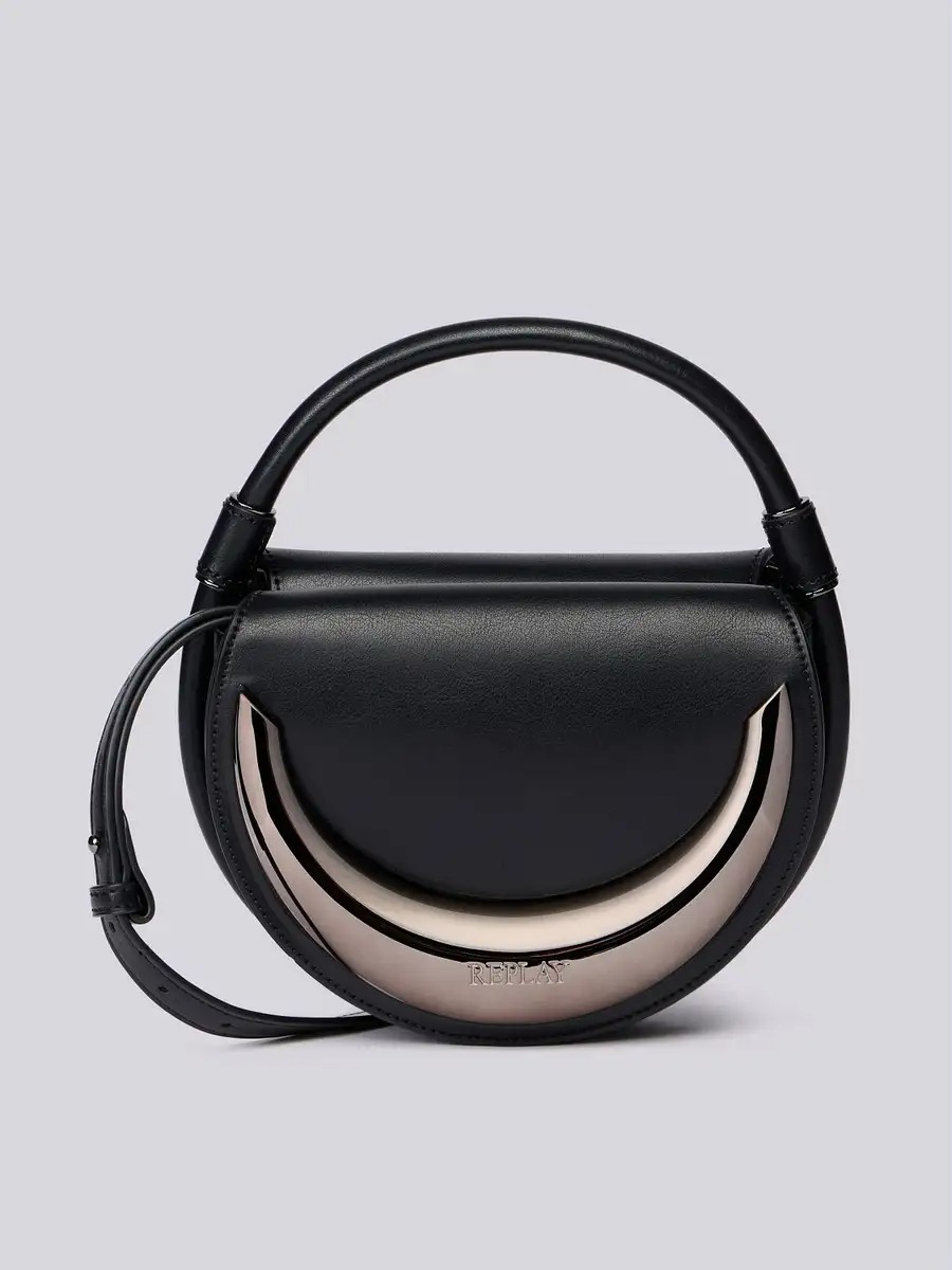 Circular bag with a smooth feel, equipped with a top handle and an adjustable, removable strap. The style features a flap and magnet button fastening on both sides. The small metallic Replay lettering on one side and the branded metal embossed half moon on the other add the finishing touches. Width 21 cm x Height 16 cm x Depth 10 cm.