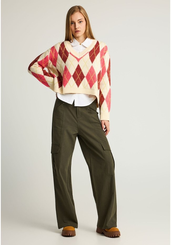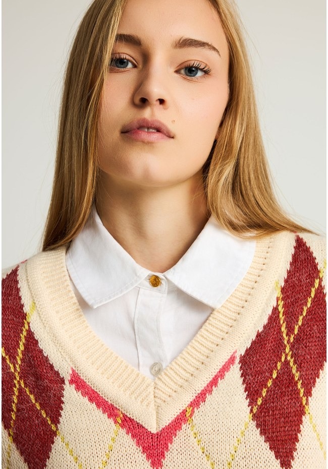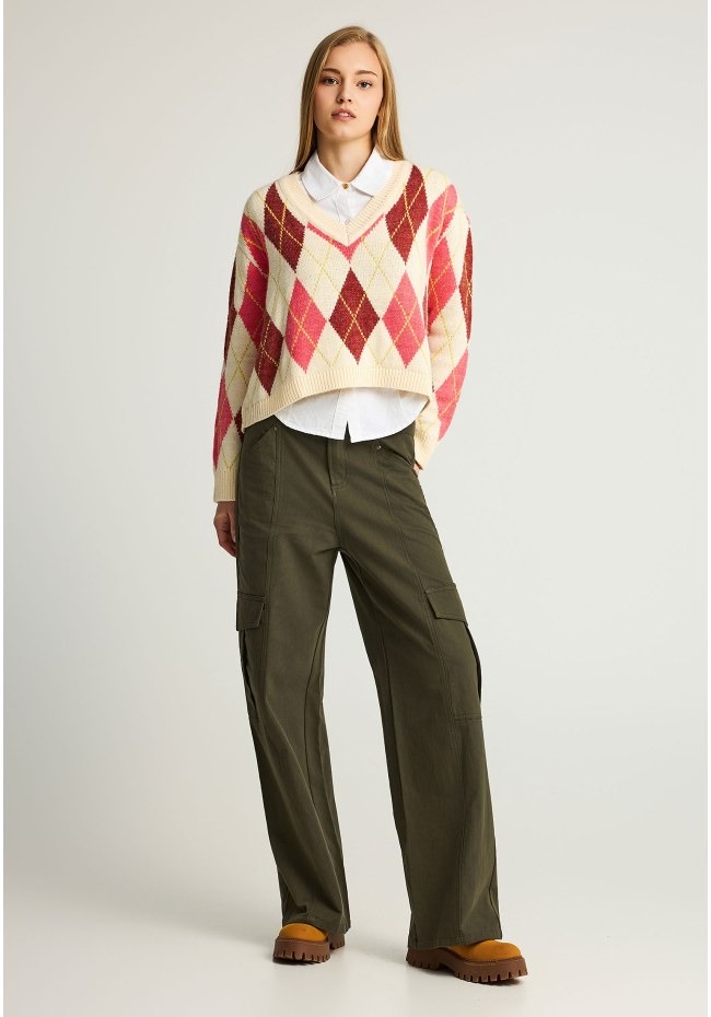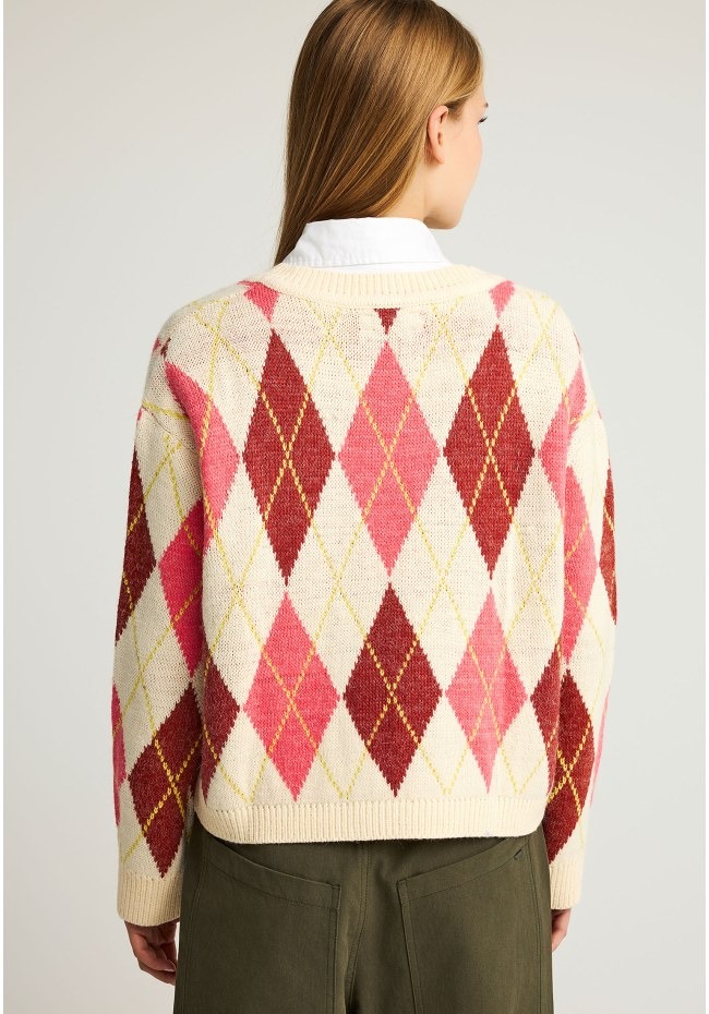 Αυτό το πλεκτό πουλόβερ έχει V-λαιμόκοψη και χαλαρή γραμμή. Το ρούχο ξεχωρίζει λόγω του εντυπωσιακού μοτίβου argyle (ρόμβοι) που καλύπτει όλη την επιφάνεια, με έντονη πολυχρωμία. Η πλέξη είναι αφράτη και ζεστή, ενώ η ριμπ ύφανση στο τελείωμα και τις μανσέτες προσφέρει καλύτερη εφαρμογή.