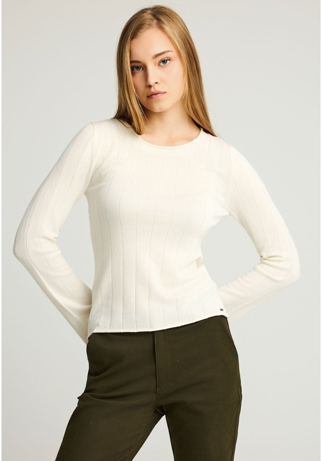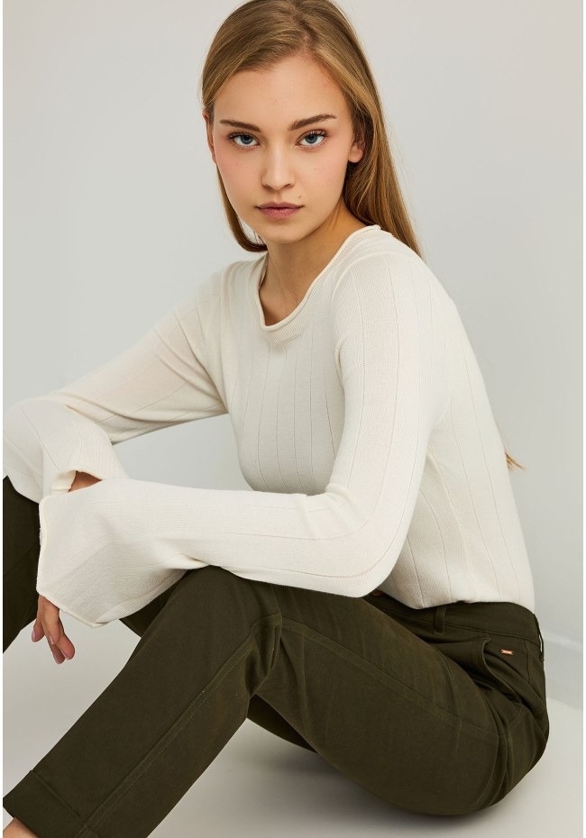 Αυτό το πλεκτό τοπ είναι το ιδανικό κομμάτι για να αναβαθμίσεις το καθημερινό σου look με μια vintage πινελιά. Η στενή, κολακευτική γραμμή του και η πυκνή κάθετη ριμπ πλέξη αγκαλιάζουν το σώμα και δημιουργούν μια εκλεπτυσμένη σιλουέτα. Το μακρύ μανίκι που καταλήγει σε εντυπωσιακή καμπάνα (flared cuffs) είναι η λεπτομέρεια που κλέβει την παράσταση. Συνδύασέ το με ψηλόμεσες φούστες ή παντελόνια για ένα look με retro vibes.