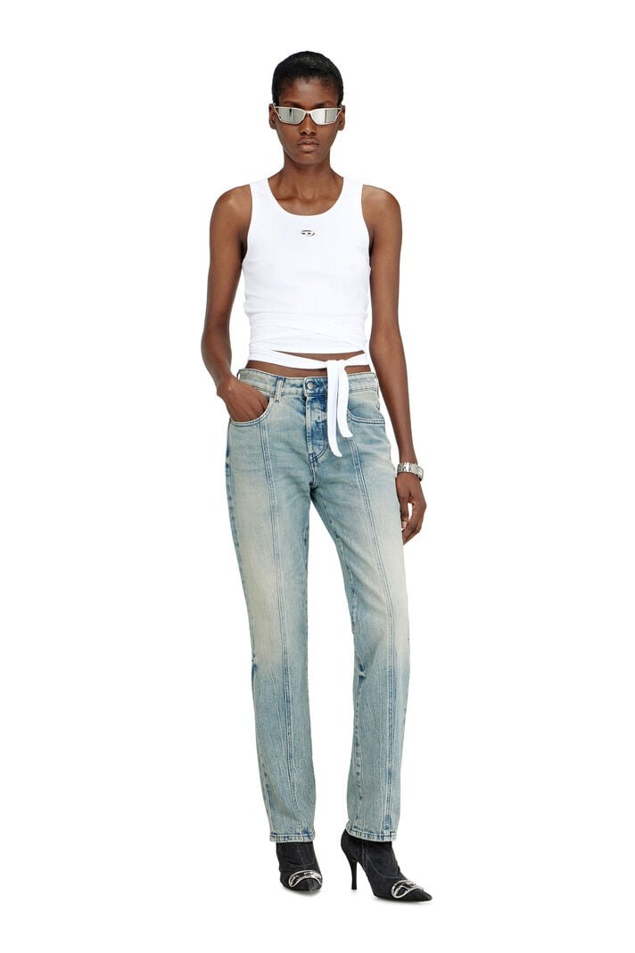 This slim-fit women’s top is made from organic stretch-cotton jersey with a fine ribbed texture for flexibility. The cropped, sleeveless silhouette features distinctive wrap-around laces that tie at the waist. The front is embellished with an Oval D laser-cut embroidery just below the collar, while the back is designed with a shorter hem for a cut-out effect.