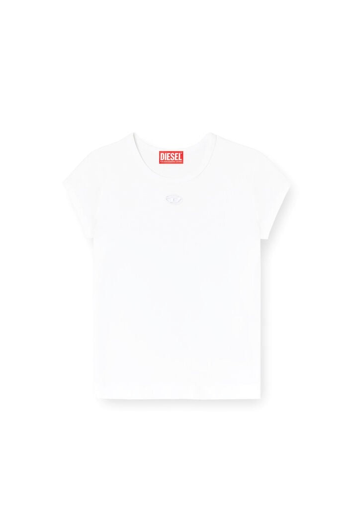 Women’s close-fitting top in a clean, essential cut, crafted from organic cotton with added stretch. A laser-cut and embroidered Oval D logo decorates the front, revealing a glimpse of skin or the layer below.