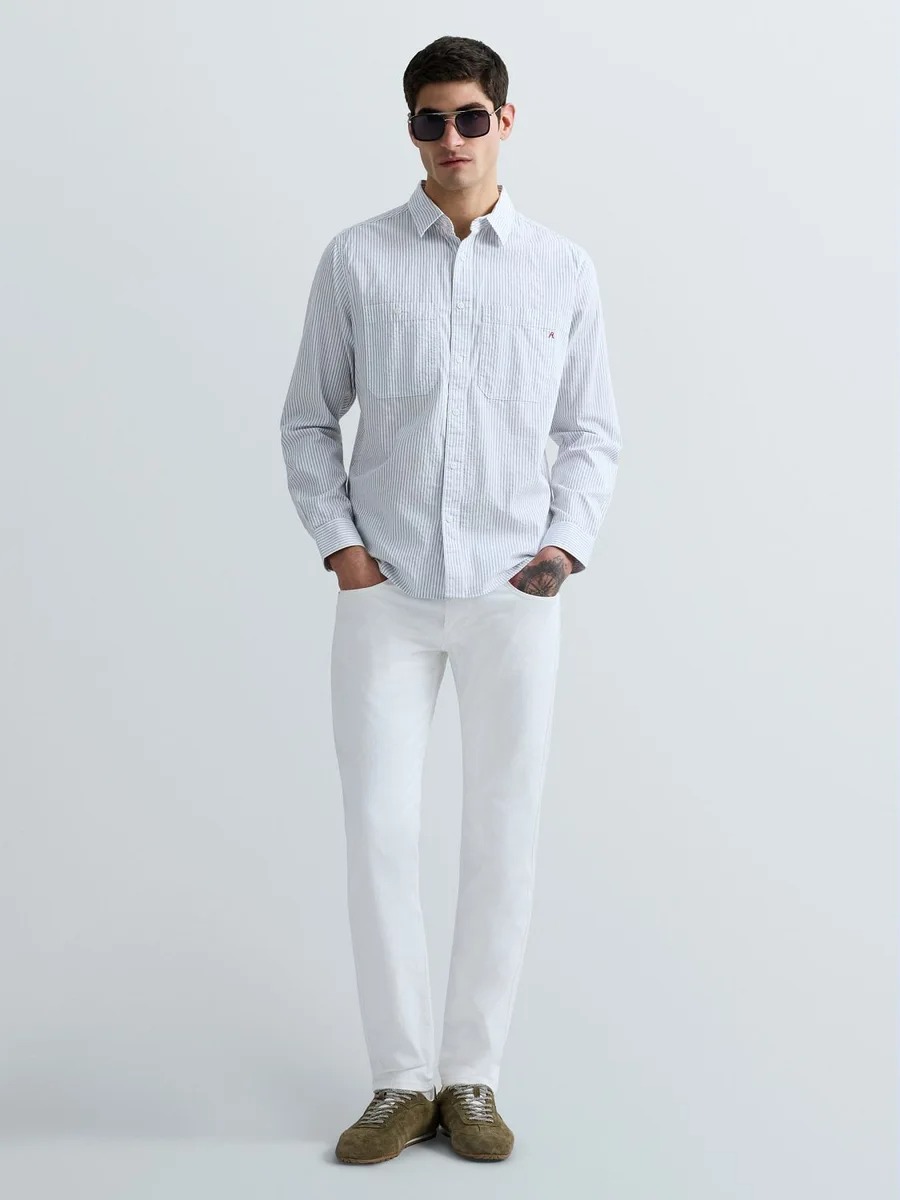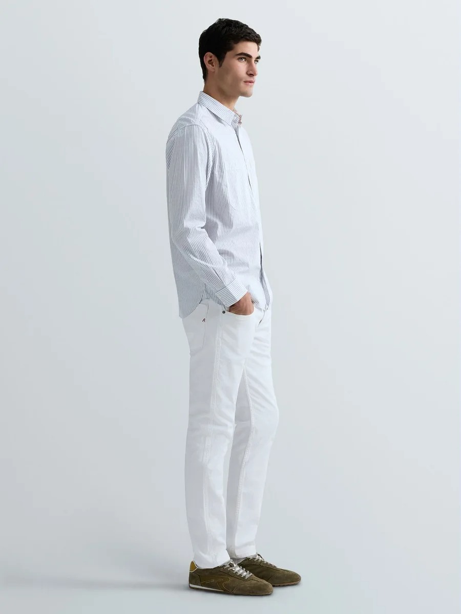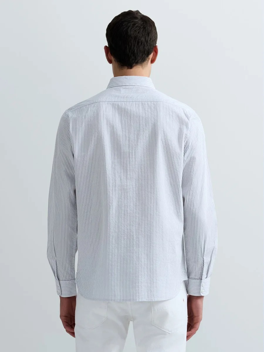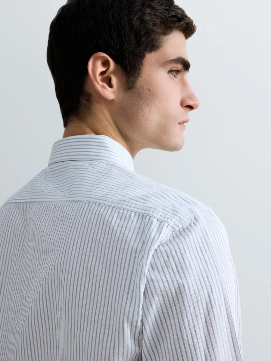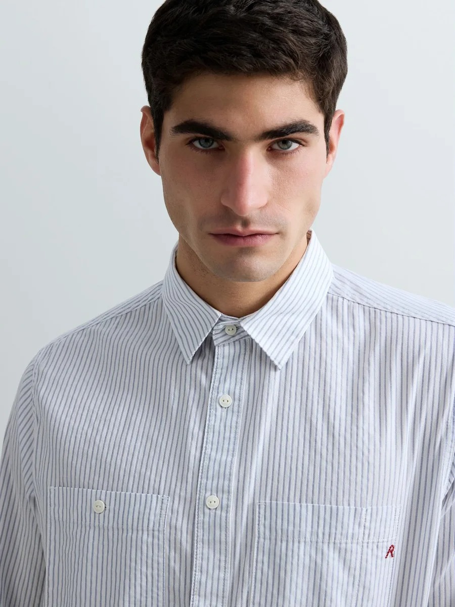 Regular-fit shirt in yarn-dyed dobby cotton with an all-over vertical-striped design. This long-sleeved style features a rounded hem, a button fastening, also found on the cuffs, and two breast pockets: one fastened with a button and the other finished with our iconic red R detail embroidery.