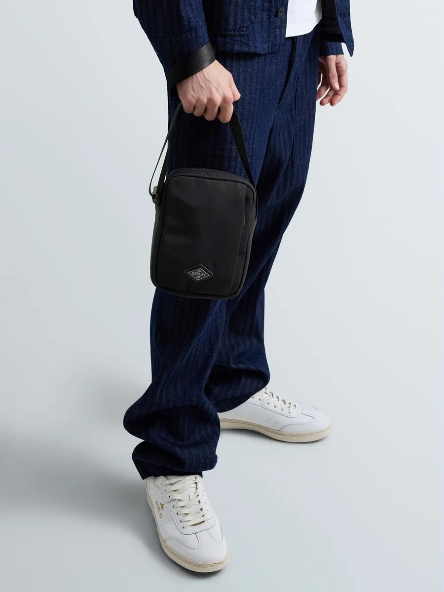 Square bag crafted from nylon with an adjustable shoulder strap and a top zip fastening. This accessory features a vertical front pocket with a hidden zip and the diamond logo on the front. Length 15.5 cm x Height 21 cm x Width 5.5 cm.