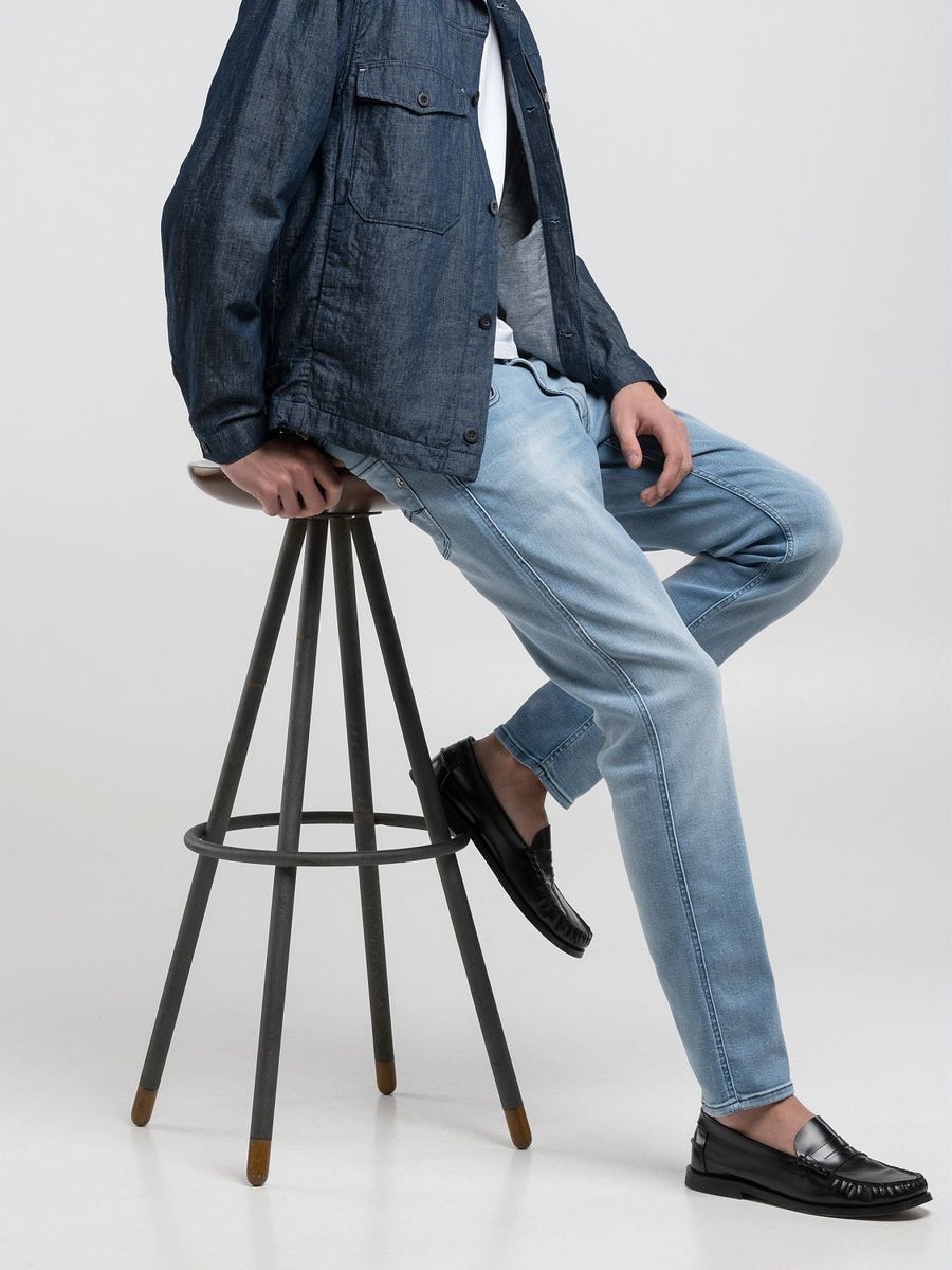Slim-fit jeans with a regular rise and a slim leg that tapers toward the hem. This five-pocket piece comes in 12-oz cotton-blend power stretch indigo denim with an enzyme wash and a light bleached stone wash. These men’s jeans feature hand-created whiskers and sanding that create colour contrast on the wear areas. The coin pocket and back pockets have our iconic gull-wing stitching, one of which bears the R rivet, while one of the front pockets features a small branded insert. Zip and button fastening.